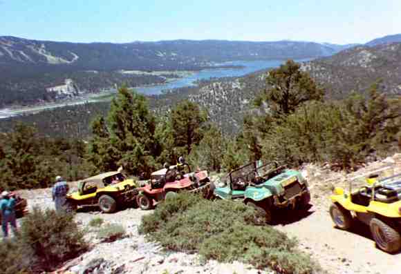 The club stopped along the trail above Big Bear Lake. Rob Heykoop's green water pumping buggy is in the foreground that came all the way from Holland.