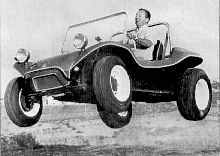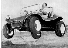 It was on Pismo Beach that he first became acquainted with "Dune Buggies". These were V8 powered "water pumpers". These machines were crude and heavy so Bruce took it upon himself to design a lightweight version that would be fun on the beach or in the wilds of Baja. After modifying a Kombi bus with wide rims (called "Little Red Riding Bus") Bruce used his expertise in boat building to design the first fiberglass bodied dune buggy.