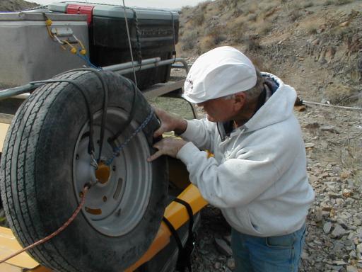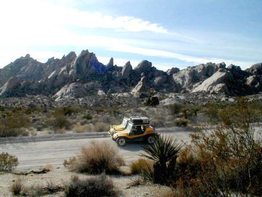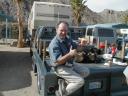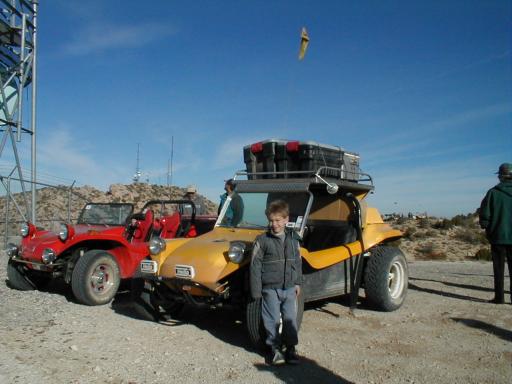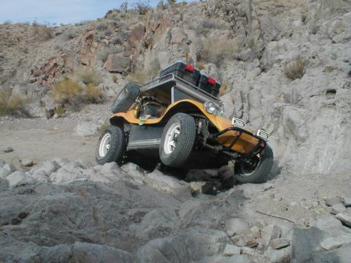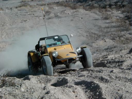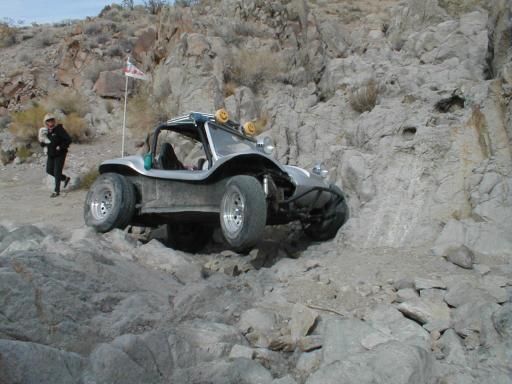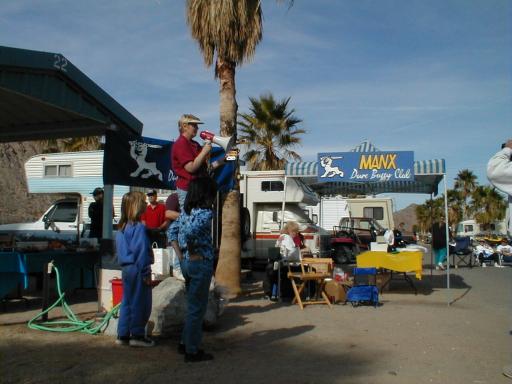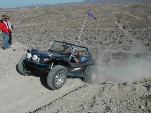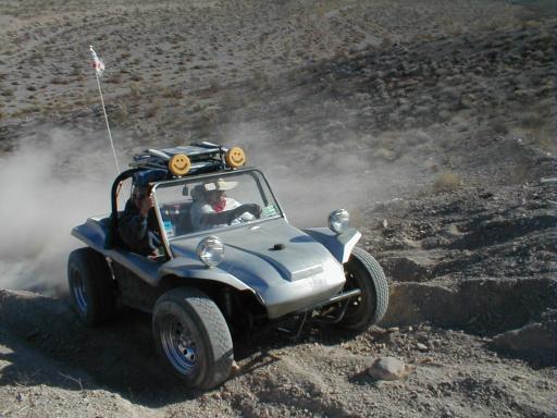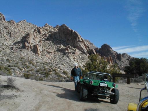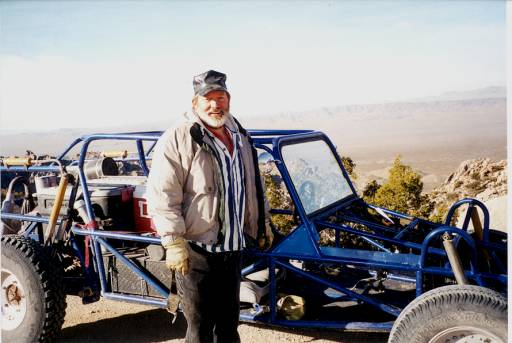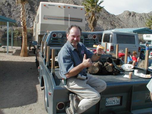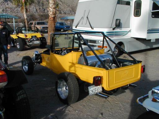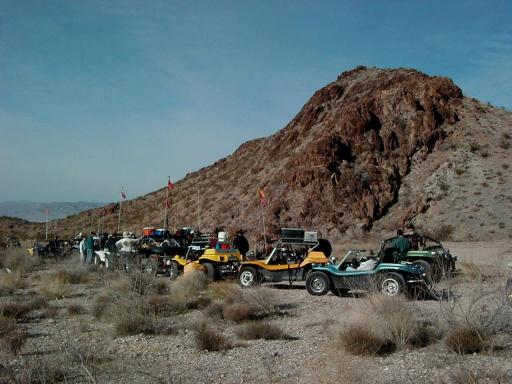 | We camped on the Colorado river just north of Bullhead City. Local buggy builder Marc Frederick (member #900 above) was kind enough to be our guide again this year. We split into three groups to enjoy either the "difficult", "medium", or the "Posey Sniffer" trails. Marc led the "difficult" capability group out on the trial the first day for some hill climbing, rock climbing, and then lunch in Oatman. |